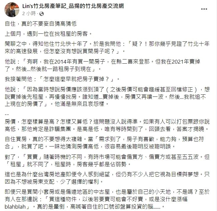 「Lin's竹北房產筆記」透露,對方言談充滿無奈與哀怨,不禁讓自己思考房價怎樣算高、怎樣算低?作者認為這問題沒人說得準,因為高低要等時間印證,必須回頭去看答案才會揭曉,還強調如果有人可以打包票訴說高低「那他肯定是詐騙集團」。