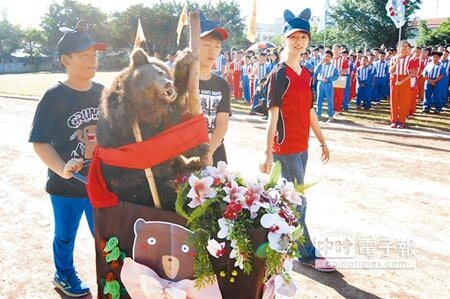 為牠命名關山國小「大學長」黑熊標本,由老師及高年級學生護駕參加校慶運動會。