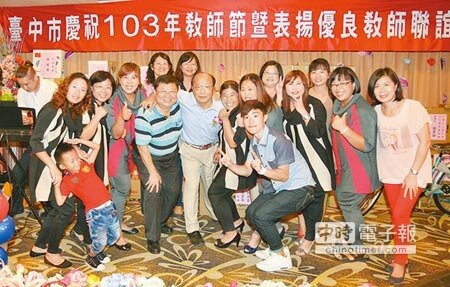 胡志強(中)昨日參加台中市幼兒教育基金會,舉行的表揚優良教師活動,並與得獎老師拍照合影互動。