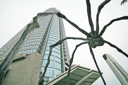 大蜘蛛藝術創作矗立在地鐵站出口,已成為六本木中城的地標。(王曉鈴攝)
