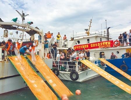 在兩岸一起宣誓「資源永續、與海共存」後,兩岸聯合放流活動在中線兩側展開。