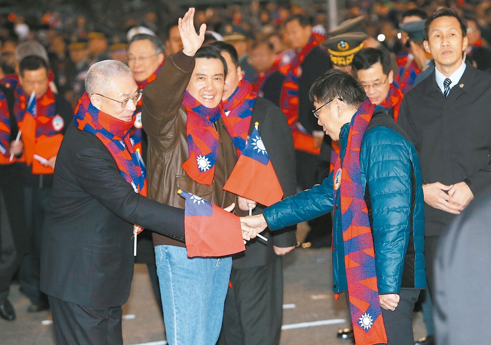 出席元旦總統府前升旗典禮,總統馬英九(中)與副總統吳敦義(左)主動趨前向台北市長柯文哲(右)握手致意。(記者林俊良/攝影)