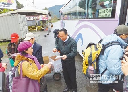 武陵賞櫻專車12日起跑,三星鄉長埤湖為其中1個接駁站,三星鄉長黃錫墉於首發之日,特別送三星蔥油餅、紅包給遊客。(記者王亭云攝影)