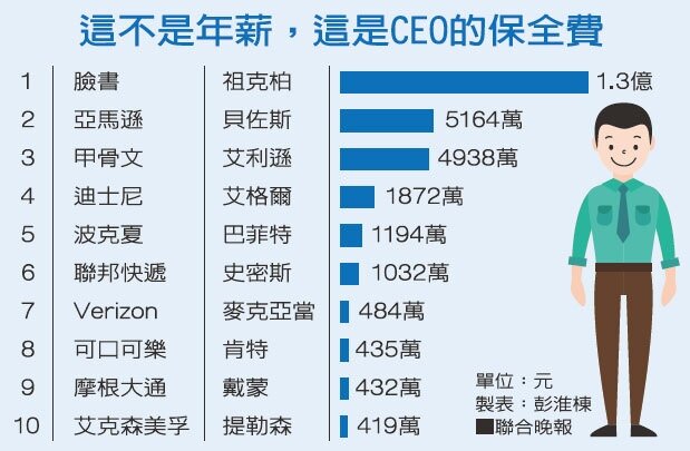 專門追蹤財星百大企業(Fortune 100)高層薪酬的網站Equilar去年報導,這百大企業給執行長的年度保全費平均是3萬美元(約台幣97萬元)。