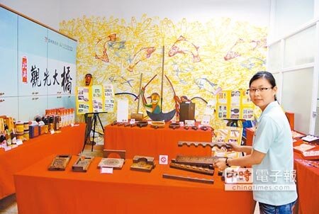 北港遊客中心展出麻油糕餅製作器具,行銷優質在地特產。(張朝欣攝)