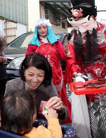 圖說:南投市長許淑華和加官送發財包給民眾,在場的幼兒也領到發財包