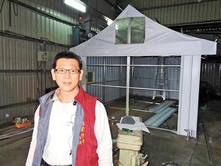 慈濟志工蔡子良研發「急難屋」,兼具環保及避難效果。(記者柯宗緯/攝影)