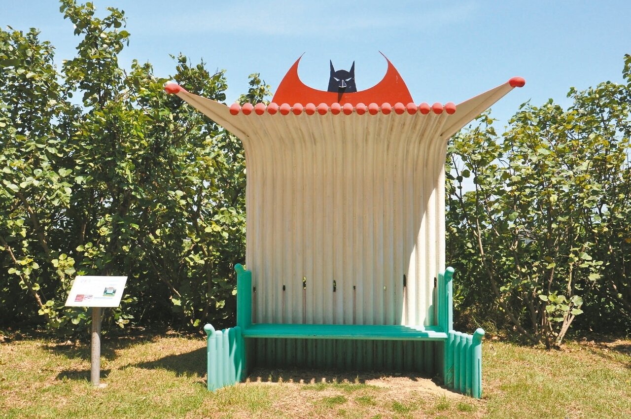 彭煜絢說,蝙蝠俠造型休息亭是今年完工的,爐管就像蝙蝠俠一樣,象徵「犧牲自己、拯救世界」,廠區同仁巧手延續廢管新生命,休息亭不僅遮風避雨,也象徵繼續守護這片淨土。