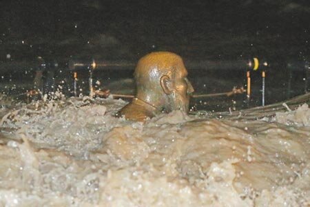 潭美掠過北台灣,適逢農曆7月15日大潮,淡水河口海水倒灌,昨晚11時河岸已淹1公尺高,著名的馬偕博士銅像只剩頭部在水面上。(記者方濬哲/攝影)