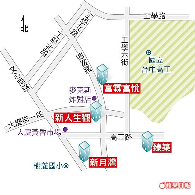 目前該區銷售中的新案「富霖富悅」位於德富路、近大慶街,規劃27戶臨路型及社區型別墅,主力為社區型別墅,面寬5~6米,戶戶雙車位,總價2688萬元起。位於高工路、高工南路口的「臻築」,面對台中高工,規劃1戶店住及5戶別墅,別墅面寬5.7米、地下室雙車位,總價2800萬元起。