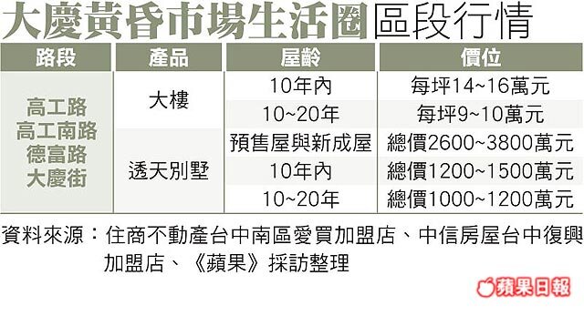 中信房屋台中復興加盟店店長林原吉表示,當地以屋齡10~20年的中古大樓居多,每坪9~10萬元,集中於高工路、德富路等路段,其中以含車位40~50坪、3房產品成交量最大。楊加立分析,屋齡10~20年、3房大樓產品總價多在400~500萬元,總價不高,吸引不少外來的年輕首購族群,年齡層多在30~50歲。