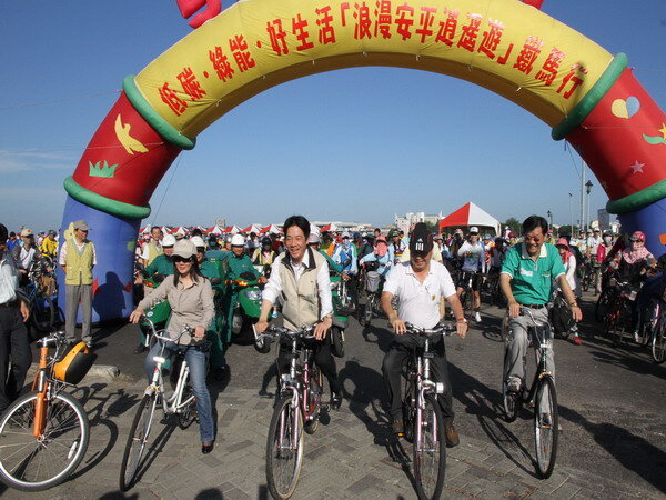 推廣「低碳安平」,凝聚民眾共識,安平區公所與台南郵局1日舉辦騎鐵馬活動,市長賴清德與環保局長張皇珍、安平區長林國明、台南郵局經理方文楨以及安平區多位里長共同鳴鼓,宣示打造「低碳安平」決心,並與安平商圈協會、區內旅館業者及電動機車業者簽署承諾書及備忘錄。
