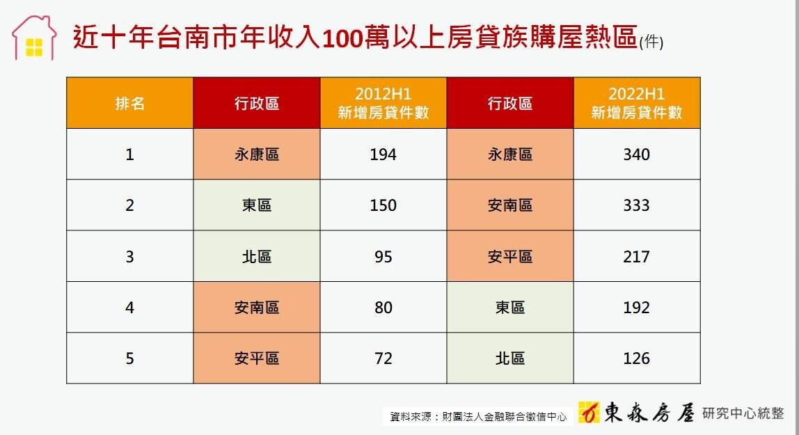 東森房屋研究中心彙整聯徵中心資料發現,今年上半年台南年收入在100萬元以上的房貸族,新增件數1893件,較2012年同期的871件大增1022件,成長幅度高達117%,顯示高收入房貸族的佔比有逐漸增加的跡象。東森房屋研究中心經理葉沛堯指出,伴隨台積電等知名大廠進駐南科,台南民眾的收入水準不斷提升,同步帶動區域房市交易量能快速升溫,購屋門檻自然也水漲船高。
