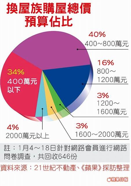 去年不少購屋族因實價登錄而觀望買房,仲介業者預期年後將出現換屋族購屋潮,據調查顯示,有21%換屋族預計在半年內購屋,但因整體薪資未上揚,換屋預算仍有限,74%不超過800萬元。