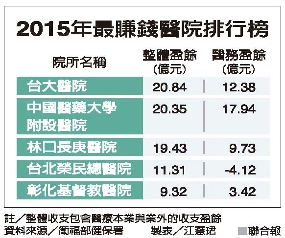 衛福部健保署公布前年醫院財報,台大醫院以廿點八四億元盈餘,首度拿下年度最賺錢醫院,中國醫藥大學附設醫院以廿點三五億元竄升到第二名。