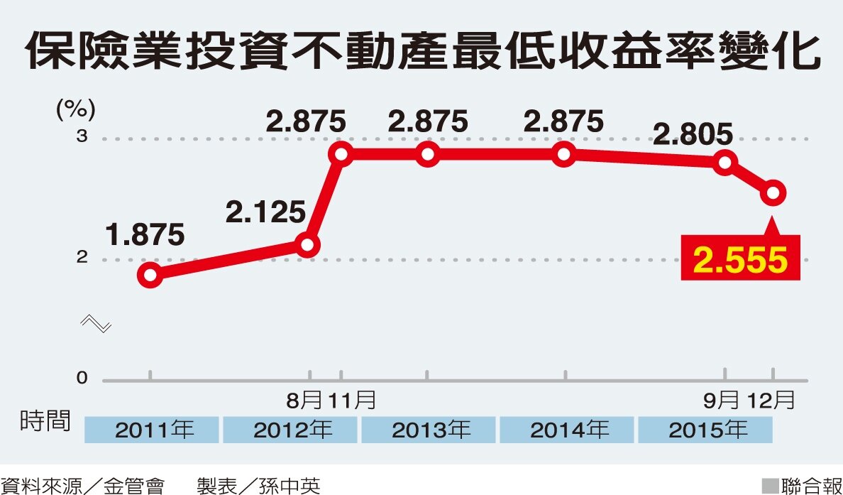 「凍結」達三年的保險業投資不動產最低收益率,終於調降了。金管會保險局昨天宣布,下周起調降保險業投資不動產最低收益率零點二五個百分點,自現行的百分之二點八零五,降至百分之二點五五五。