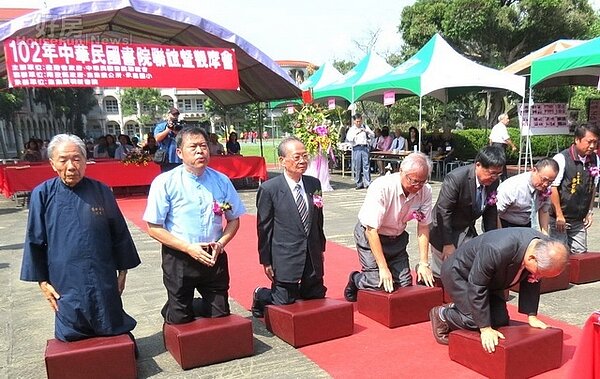 102年中華民國書院聯誼暨觀摩會中,台灣省政府主席林政則率各代表,以古禮祭拜明新書院供奉的文昌帝君。(記者吳素珍攝)