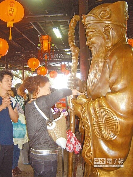 新北市中和「烘爐地」南山福德宮,信徒摸一摸土地公神像,換「庫錢」帶回家當發財金。(擷取自/中時電子報)