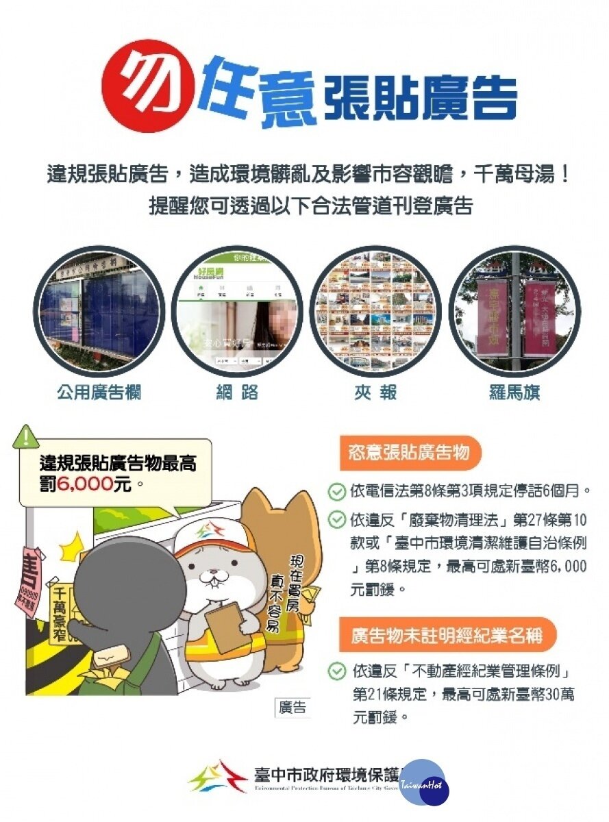 環保局表示,市府針對違規廣告物案件,可依不同法源裁處,例如依《廢棄物清理法》第27條第10款、《臺中市環境清潔維護自治條例》第8條,處3,000元至6,000元罰鍰,或依《電信法》第8條第3項規定,予以停話處分。此次經查獲房仲業者違規事證明確,除依《電信法》第8條第3項規定停話,也移請地政局依《不動產經紀業管理條例》,裁罰6萬元以上、30萬元以下罰鍰。