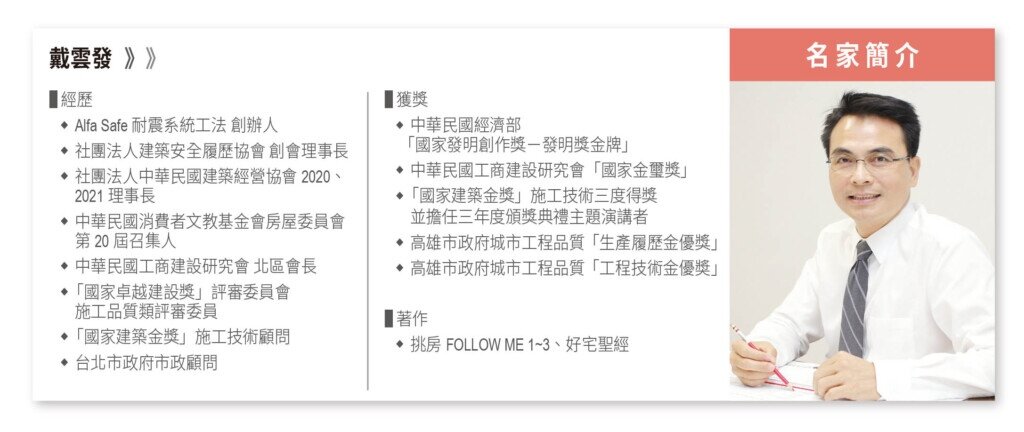 台灣位處於板塊活躍的地震帶上,每一次地牛翻身,都讓我們深切體會到,一棟房子不只是為我們遮風避雨的居所,更是發生天災時守護全家生命的重要場所。然而,我們買房時經常把注意力放在地段、屋齡或裝潢等看得見的部分,忽略了房子的價值不僅止於此。