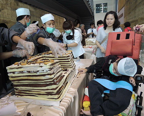 竹山國中特教班學生努力的完成彩繪斷層蛋糕。
