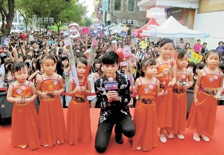 美麗島大道暑假周末活動多,圖為藝人Bii畢書盡到美麗島大道參加活動,與可愛小朋友合影。(記者張啟芳/攝影)