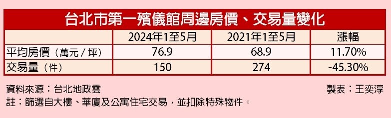 根據台北地政雲資料,以一殯周邊500公尺的住宅用大樓、華廈以及公寓為統計範圍,該區域在2021年1至5月的平均房價約68.9萬元/坪,交易筆數達274筆;而到了2024年的1至5月,則僅僅累計150筆交易,減幅高達45.3%,但平均房價卻有11.7%漲幅來到每坪76.9萬元。