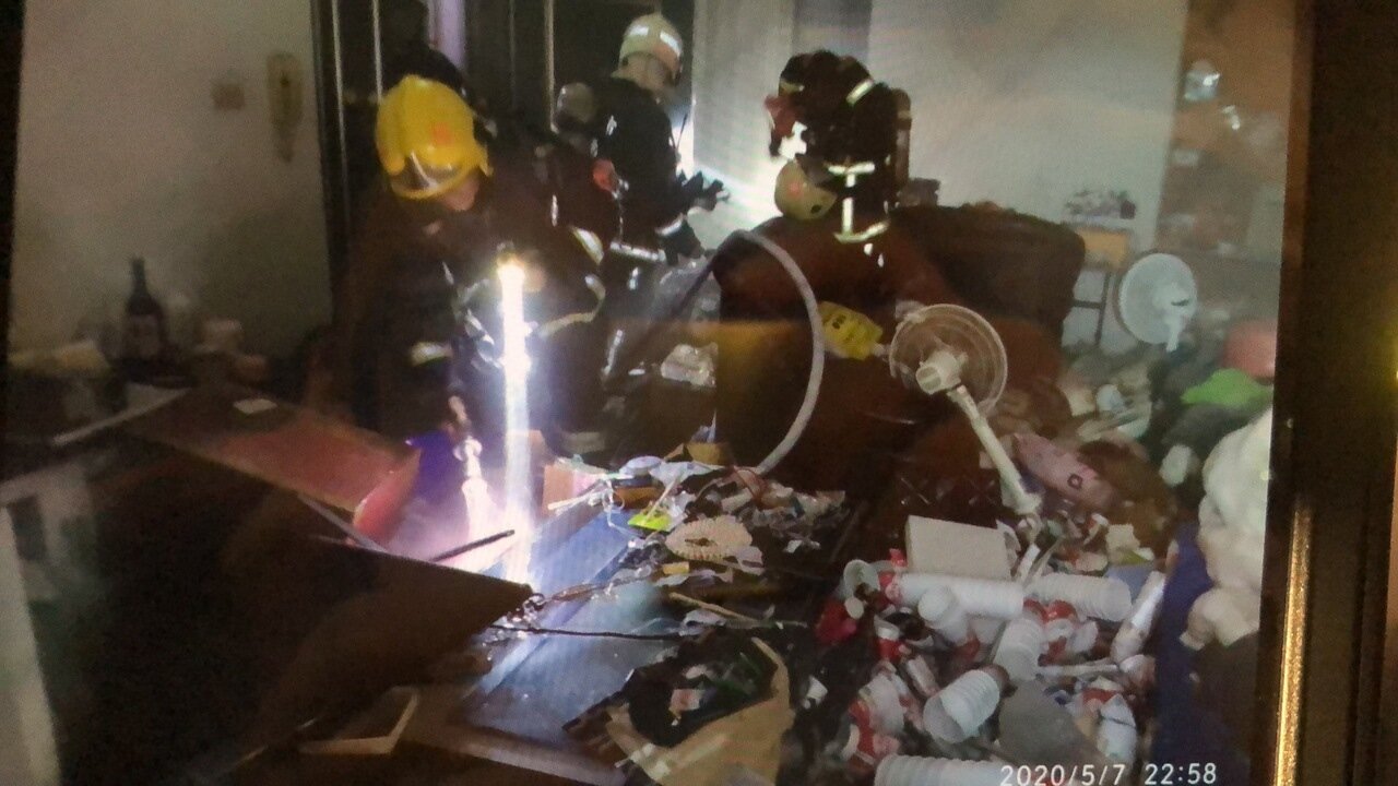 消防局第一分隊分隊長楊友仁率第一、第二、東區、蘭潭和湖內分隊到場搶救,發現燃燒面積約6平方公尺,起火處在客廳茶几,堆放許多雜物和垃圾,電風扇被燃燒殆盡,現場格局為3房2廳,但消防人員入內清查,幾乎無行走空間。