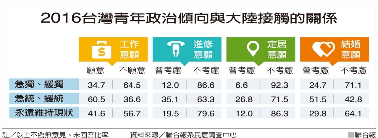 台灣年輕人自身的統獨態度,也牽引他們與大陸接觸的意願。傾向統一的人,六成一有去大陸工作的意願,五成二願意跟大陸人戀愛或結婚,三成五有進修意願,二成七願意考慮去大陸定居;傾向獨立的人,跟大陸接觸的意願相對低很多,分別為三成五有工作意願,兩成五考慮婚姻或戀愛,一成二願意考慮去進修,只有百分之七有定居意願。