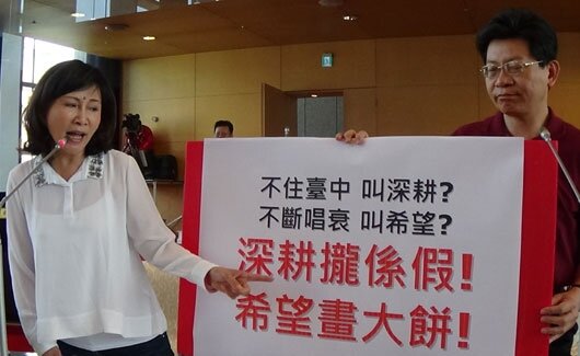 黃馨慧與洪嘉鴻昨批評林佳龍號稱在台中深耕10年,卻沒在台中買房子;口口聲聲說希望,結果都是畫大餅,兩人看板寫著「不住台中叫深耕、不斷唱衰叫希望?」