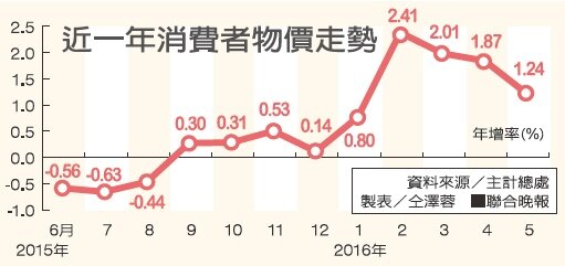 主計總處綜合統計處副處長蔡鈺泰表示,5月蔬菜價格較去年同月上漲二成,水果也上漲三成,加上水產品、肉類與外食費皆上漲,總計食物類上漲5.82%;但因為油料費下跌超過一成,交通及通訊類也下跌,加上居住類的燃氣及電費下跌都超過一成,抵消部分漲幅,整體物價上漲1.24%。