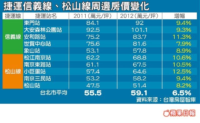 施工至今已8年的捷運信義線,預計將於年底通車;另一條貫穿市中心的捷運松山線,則預計於明年底通車。兩條線都經過台北市精華地段,雖周邊房價已在高點,但隨著交通便利性增加,沿線房價1年仍有8%以上漲幅,都超過北市平均6.5%的成長。