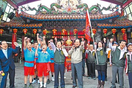 宜蘭四結福德廟此次唯一受邀代表「福德正神廟宇」,進駐今年台灣燈會慈善祈福大法會,21日上午副縣長吳澤成(右抬轎者)授旗。(圖/王亭云攝)