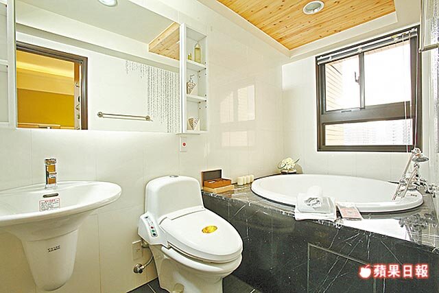 建材配備:外觀採石材基座搭配二丁掛磚,室內地坪鋪設60公分見方拋光石英磚,廚房配人造石檯面廚具,主臥衛浴配備浴缸,馬桶有免治馬桶座