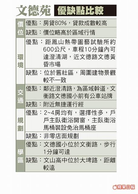 該案隔八德路面對文德國小,10分鐘車程內可至鳳山熱帶園藝試驗所及澄清湖,休憩機能充足。開價雖略高於區域行情,仍屬合理範圍。但該案附近並無捷運站,僅能利用公車通往市區。