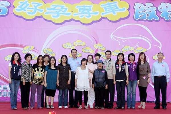 圖說:市長朱立倫、議員江永昌、黃林玲玲、陳儀君、白珮茹、劉美芳、王淑慧、蔡淑君、黃桂蘭及懷孕的準媽媽等見證下,宣告「好孕專車」正式上路。(記者黃村杉攝)
