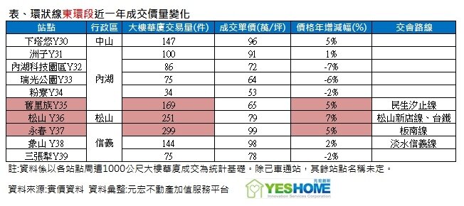近一年以位於內湖、松山、信義的Y35~Y37站點,因與其他捷運路線包含松山新店線、板南線、淡水信義線等共構,加上有鄰近新興重劃區或機能完整等優勢,表現最為突出,交易件數居東環段10個站點的前3位,房價漲幅也較大,年漲幅約5~7%之間。