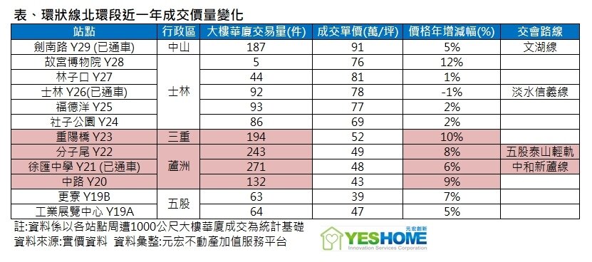北環段各站點近一年房市表現,以Y21~23站最突出。(圖/元宏不動產加值服務平台提供)