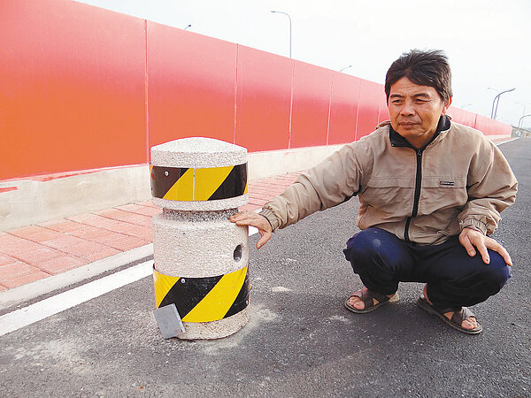 嘉義縣六腳鄉農民呂文富向聯合報投訴,他的妻子就是撞到蒜鰲自行車道橋這根車阻水泥柱才造成重傷,要求縣府拆除橋上4根車阻水泥柱。(圖/黃煌權攝)