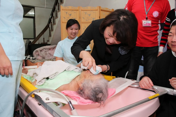 嘉義市中華聖母社會福利基金會,六年前率先自日本引進全國首輛「到宅沐浴車」廣受好評。今年中華聖母社會福利基金會在「新光鋼添澄基金會」及社會愛心人士的支持下,引進最新一代到宅沐浴車,21日在85歲的失能長者黃陳彩蓮阿嬤家門前,舉辦啟用儀式,儀式完畢之後,三位專業護理人員以熟練與溫柔的技術,為黃陳彩蓮阿嬤洗澡沐浴。看著黃阿嬤在護理人員悉心照顧之下,舒適的洗頭洗澡,黃市長與在場人員們非常感動。