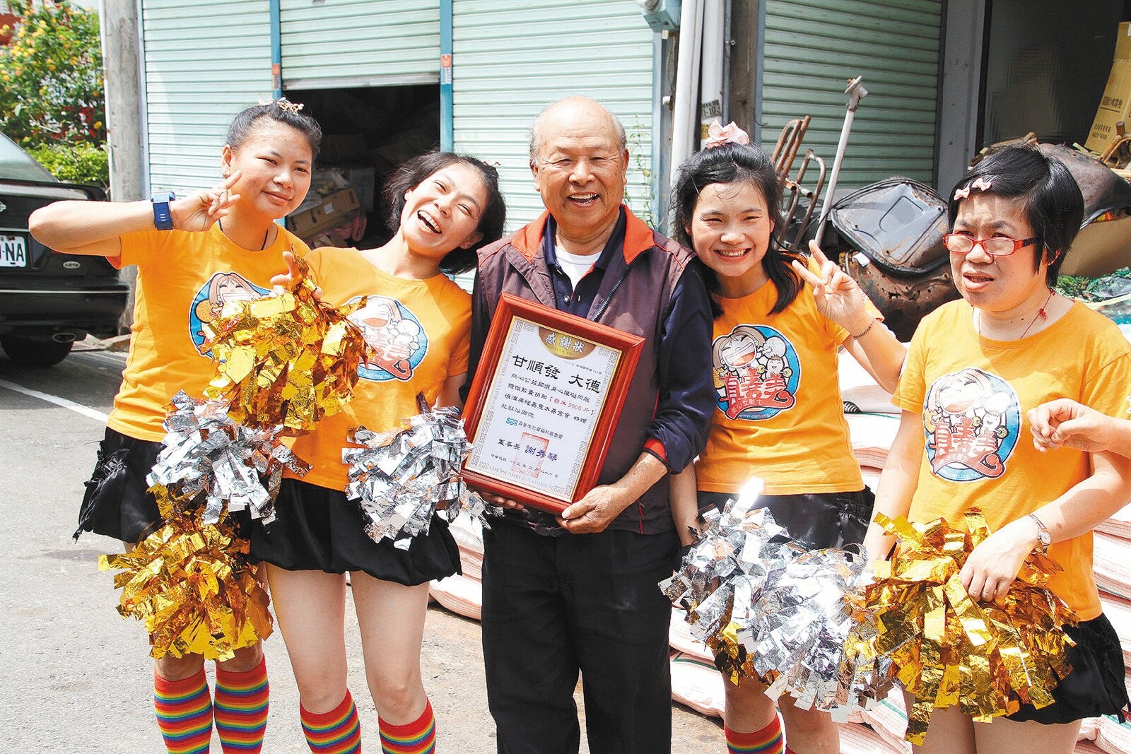 甘順發(中)多年來與獅潭鄉親一起募白米,捐贈真善美啟能發展中心,院生組成的「美少女戰士」昨天特地來獻舞,表達對「阿公」的感激。(記者胡蓬生/攝影)