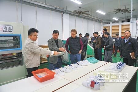 虎科大成立製鞋技術中心,業界老闆及主管幹部參觀該中心,左一為校友慧春鞋業副總陳金土。(許素惠攝)