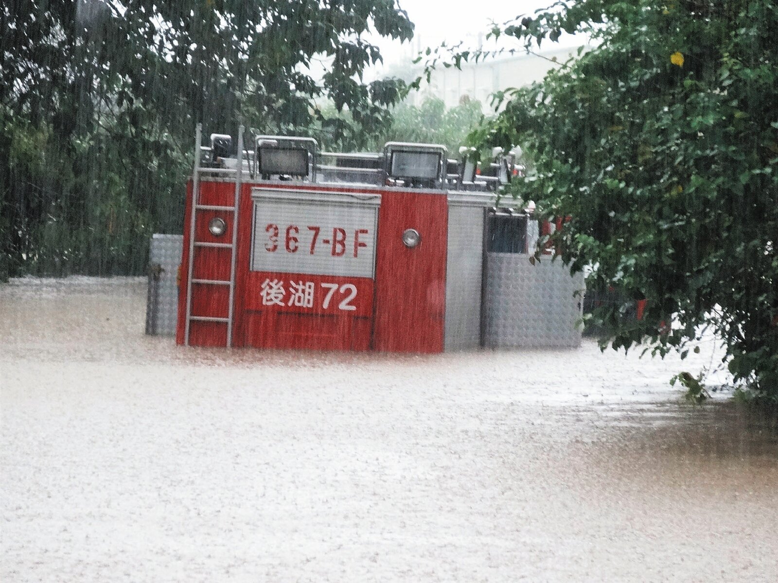 嘉義市後庄里東義路盧山橋前路面積水,消防車拋錨大水中。 (記者魯永明/攝影)