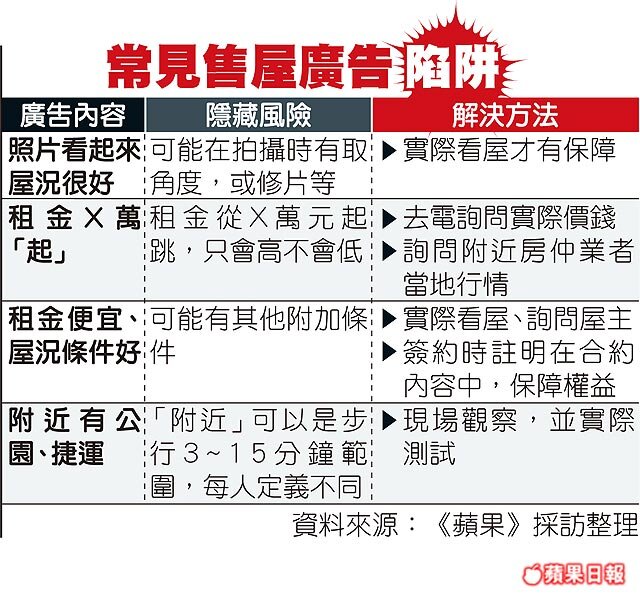東森房屋法務經理周秉瀛說,廣告內容雖吸引人,但民眾買屋租屋前,建議先打電話向屋主詢問實際狀況,多觀察比較。