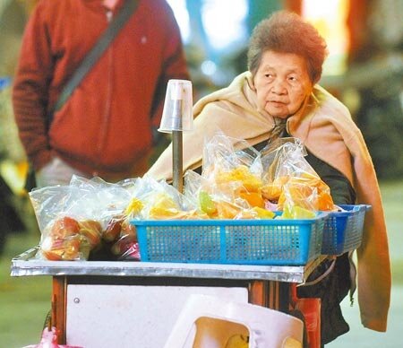 景氣好冷! 寒流天冷,景氣更冷!保「2」宣告破功,主計總處公布修正後今年經濟成長率(GDP),由8月預測的2.31%,下修0.57個百分點至1.74%。圖為西門町老婆婆披著毛大衣、頂著冷風,推車販賣水果維生。(記者陳君瑋/攝影)