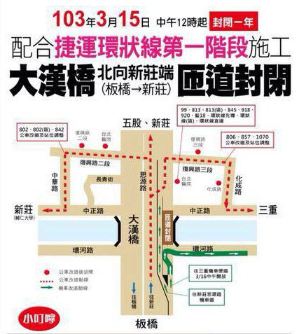 大漢橋新莊端匝道因環狀捷運施工,新莊端匝道17日封閉,交通局及警察局運用廣告、LINE群組簡訊、告示、布條等,提醒用路人改道及封閉訊息,啟動多項因應措施,以降低民眾因改道所造成的不便。交通大隊長黃家琦表示,施工初期,員警交通疏導崗的時間將會視實際需要來延長,並呼籲所有駕駛人務必要遵守交通規則。