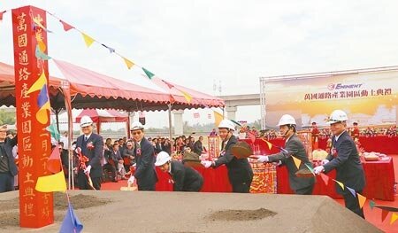 萬國通新廠動土儀式,由台南市長賴清德(右2)、萬國通董事長(右3)、前經濟部長施顏祥(左2)、經濟部次長杜紫軍(左1)等人共同主持。(記者陳惠珍/攝影)