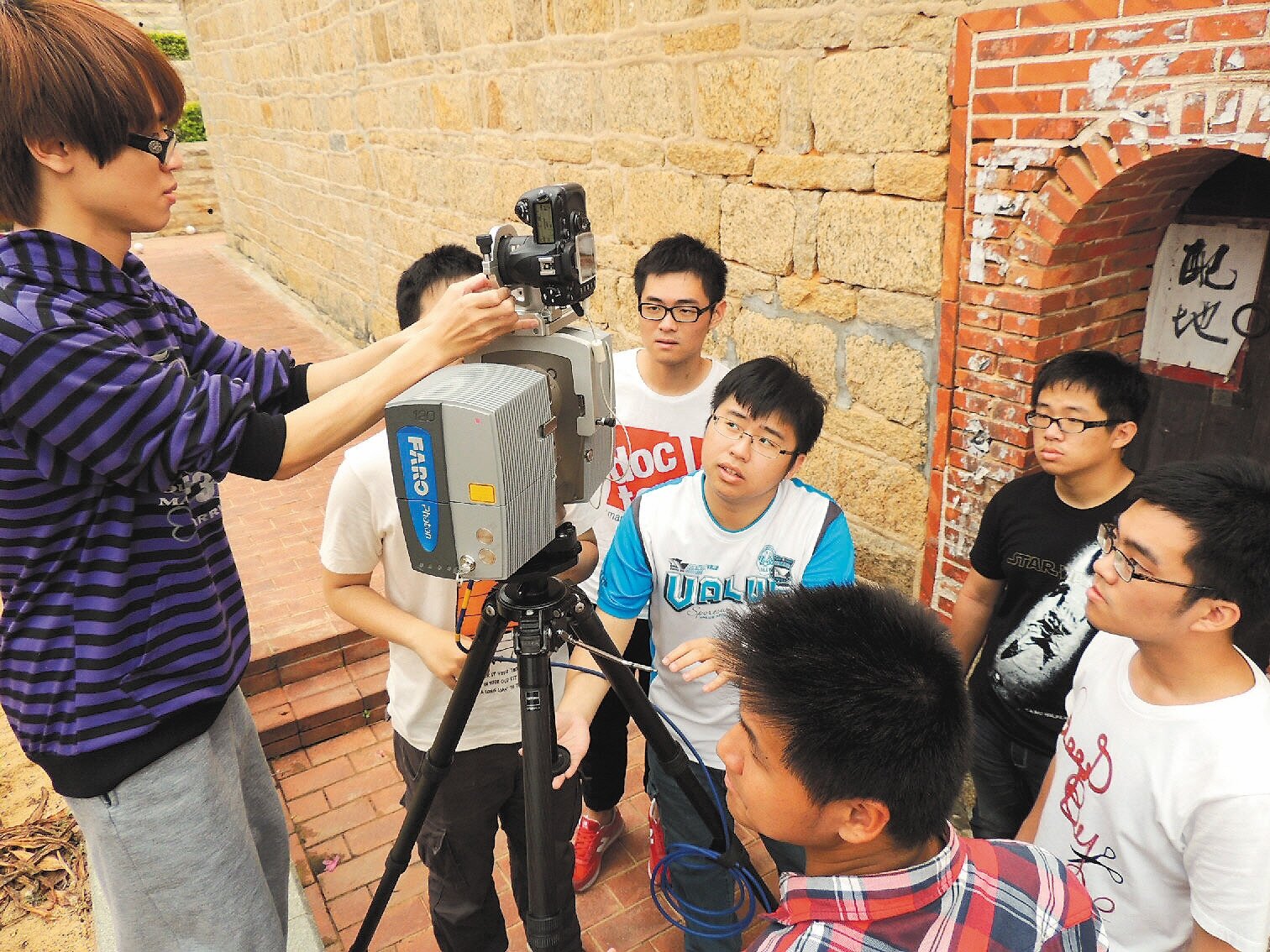 歷史建築順濟宮將拆除重建,金門大學土木系學生利用精密儀器,留下最後珍貴紀錄數位典藏。(記者陳向鑫/攝影)