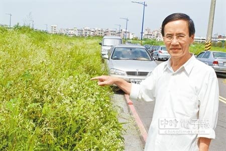 蔡永泉與李冰丹9日到嘉義市興安街203巷旁空地查看,銀膠菊蔓延約3、4分地,約120至150公分高,銀膠菊葉型像艾草,花朵像滿天星,白花綠葉模樣討喜,事實上它的腺毛、短柔毛及花粉,易造成人體過敏性反應。