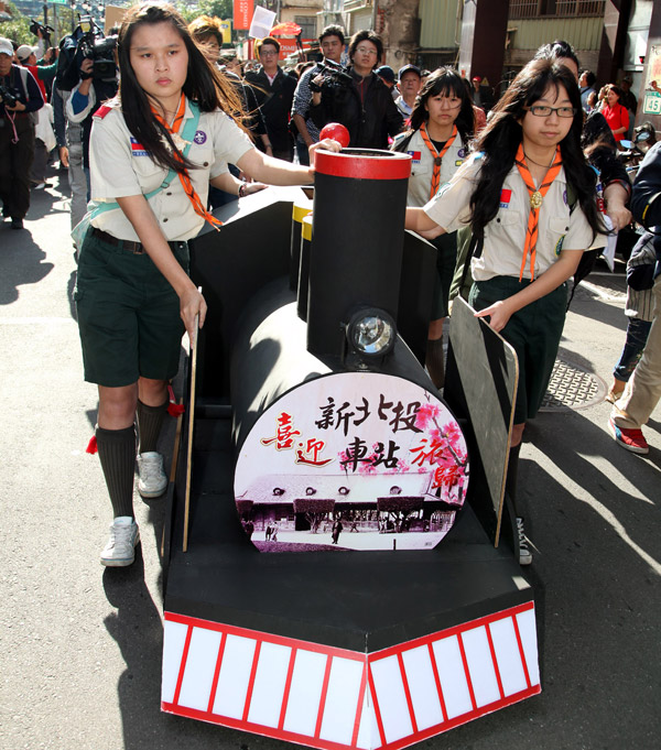 北投鄉親在鑼鼓喧天中,於捷運北投站廣場一起迎接離開臺北25年的新北投車站回家。對於外界高度關注新北投車站何時風華再現,市長郝龍斌強調,一定會在105年新北投車站的100週年慶前,落成啟用,對外開放。
